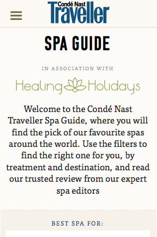 CNTraveller announced a partnership with Healing Holidays, who sponsor the coveted yearly spa awards in the CNTraveller magazine. We had to work to a strict deadline and worked with them to create a beautiful interactive spa guide that mirrored the magazine results. You are able to select the type of spa and location to narrow…